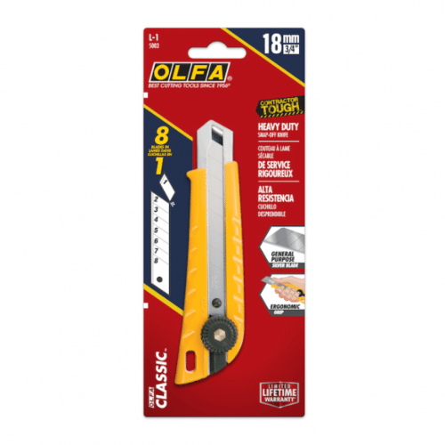 Our Olfa L-1 PRO-18 Heavy Duty Knife offers precision and durability for professional use. Designed for a wide range of cutting tasks, this heavy-duty utility knife is perfect for construction, crafting, and general maintenance. The L-1 PRO-18 ensures clean and accurate cuts every time, thanks to its robust construction and ergonomic design, making it a reliable tool for demanding environments.